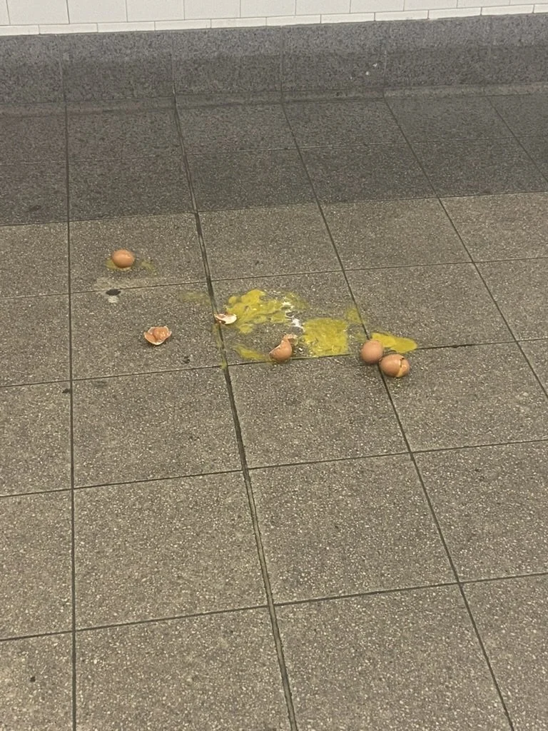 A highly realistic documentary-style photograph of at least five pigeons in a New York City subway station, gathered in a loose imperfect circle on the ground in the center: an open brown cardboard egg carton containing a dozen eggs, some broken, with egg yolk and cracked shells scattered across the dirty subway floor. The pigeons are naturally interacting with the eggs, pecking, stepping, circling, some ignoring them, some with small eggshell fragments casually resting on their heads or beaks. Each pigeon is wearing green sculptural sunglasses EXACTLY matching the reference image, same flower-shaped frame design, same translucent green material, same proportions and thickness. The sunglasses are properly worn on the pigeons’ heads, aligned with their eyes, sitting naturally on their beaks and face structure, correctly scaled, not oversized, not floating, not separate objects. Subway environment: white tiled walls, grime, subtle graffiti, metal columns, worn textures, authentic NYC subway atmosphere. Lighting: harsh overhead fluorescent subway lighting with slight green tint, uneven and imperfect, soft shadows. Composition: low angle, close to the ground, intimate framing, shallow depth of field, some pigeons sharp, others slightly out of focus. Style: hyper realistic, documentary photography, not stylized, not cartoon, natural imperfections, slight grain, imperfect exposure. Textures highly detailed: feathers, wet egg yolk, cracked shells, dirty floor, subtle reflections. Loewe campaign tone, absurd but grounded in reality, quiet luxury surrealism --ar 3:2 --style raw --v 6 --q 2 --chaos 5